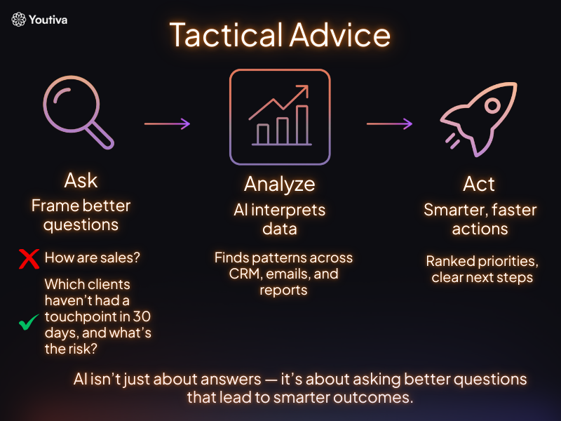 - Ask: “Which clients haven’t had a touchpoint in 30 days, and what’s the risk?”